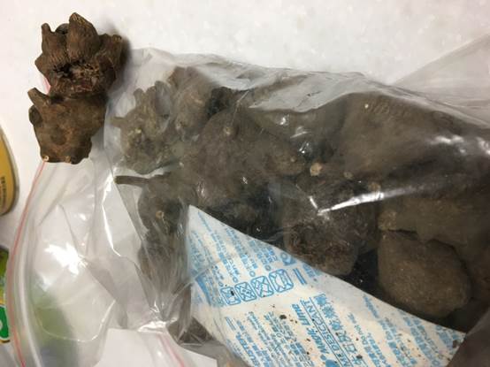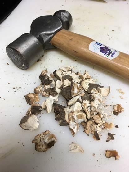 因為是乾燥品,所以跟石頭一樣。一定要用鐵鎚伺候。