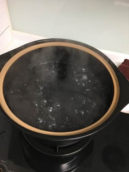 這時候先在砂鍋裡注入半鍋水,開始煮,準備沸水待用。
